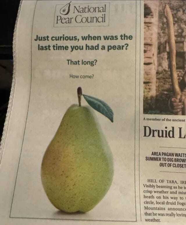 I know this is a shitpost, but to answer honestly… the last pear I had was when I was a child, and I’m in my 40s now.