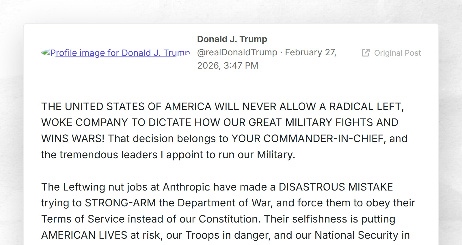 The Leftwing nut jobs at Anthropic have made a DISASTROUS MISTAKE trying to STRONG-ARM the Department of War, and force them to obey their Terms of Service instead of our Constitution. Their selfishness is putting AMERICAN LIVES at risk, our Troops in danger, and our National Security in JEOPARDY.