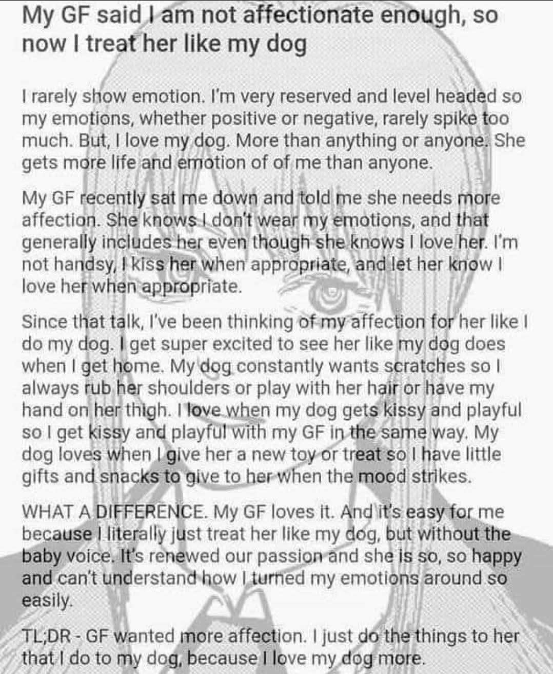 OP scratches gf behind her ears, puts her outside, fucks the dog.
