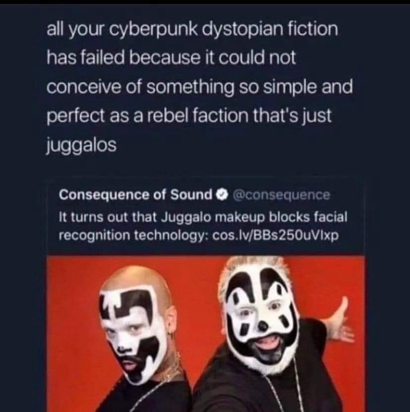 Yeah I was gonna say, there’s basically juggalos in 2077, and I’m fairly sure I read that they existed in 2020 too