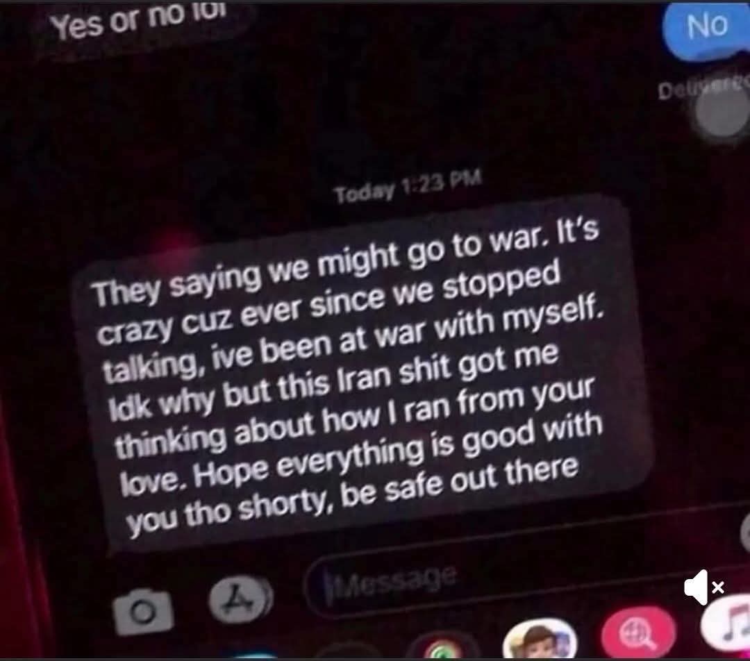 They saying we might go to war. It’s crazy cuz ever since we stopped talking, ive been at war with myself. Idk why but this Iran shit got me thinking about how I ran from your love. Hope everything is good with you tho shorty, be safe out there