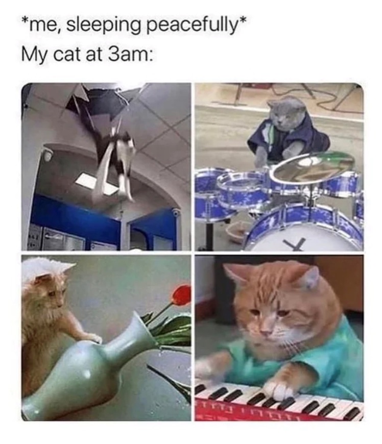 what about the cat that runs up and down the hallway at night with her ball in her mouth yelling “look at me! i have my ball!” (you know the meow) and while playing footie with another ball at approximately 85dB. and if you get up and look at her, she just lays down and says “oh! it is time for pets and plays!” but the game she wants to play is “do not pet me”