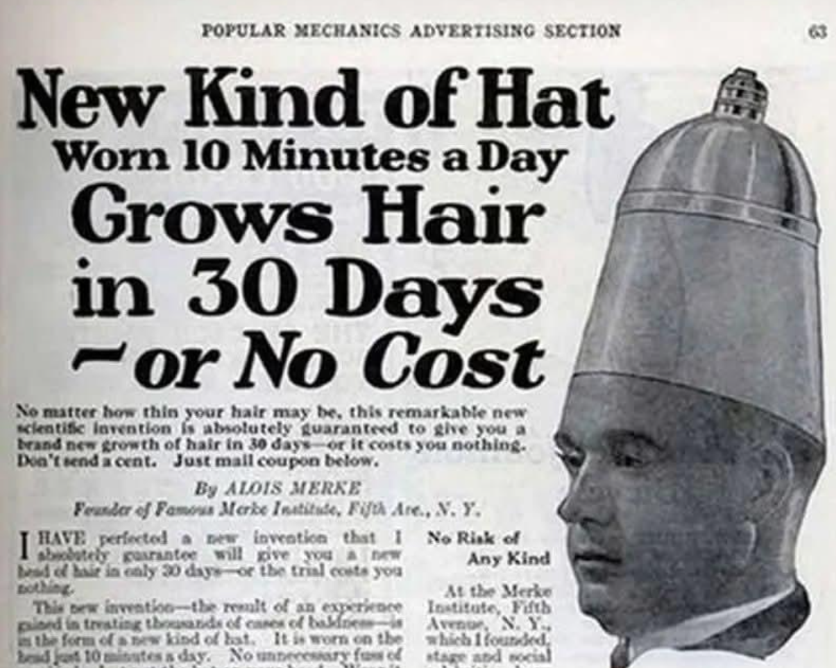 back to this device itself - I found it to be intriguing tech that merke patented in the 1920s that featured blue light and infrared to stimulate follicle growth. it may not work but that’s an interesting approach that feels genuine. maybe it has an effect on some? almost feels worth exploring further than abandoning as just another device scam of the mail-in catalog era.