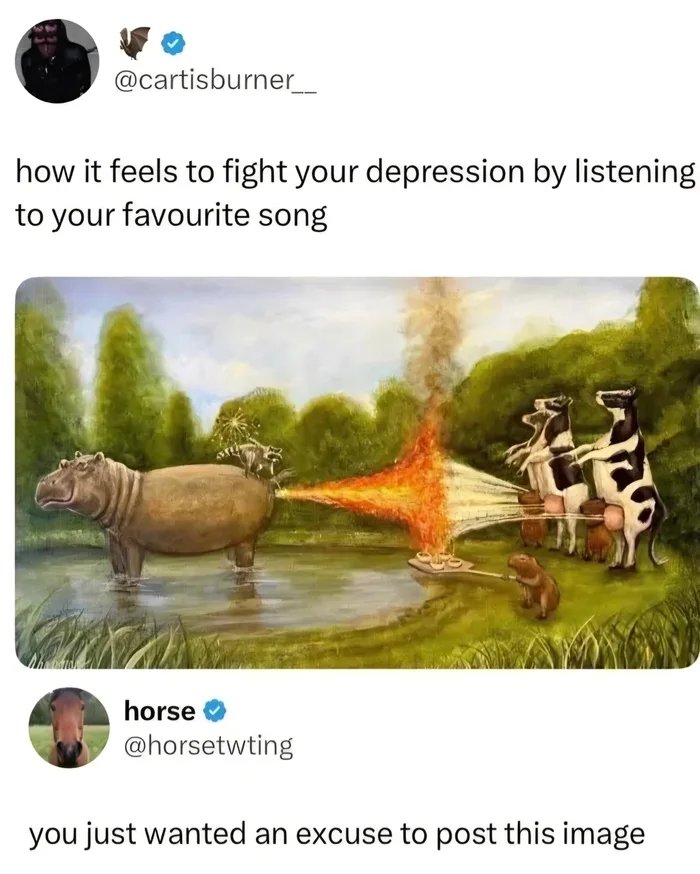 cross-posted from: https://sh.itjust.works/post/56912407 Update: Found it https://www.travischapmanart.com/product-page/hippo-fart-milk-battle-crème-brûlée-harvest-capybara-raccoon-cows-original No time to explain get into the van.