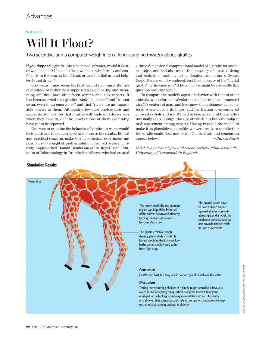 The issue with that is it would create a very large lever arm (not really a lever arm, but it’s the closest way I have to describe it) with the buoyancy force of the neck disappearing unless the neck is placed in the water, and if the giraffe is holding it’s head up higher, the angle necessary to have the neck in the water while the body (the other significant buoyancy provider) is also in the water would dunk even more of the giraffe’s face in the water, almost certainly plunging the giraffe’s nostrils and mouth below the surface.