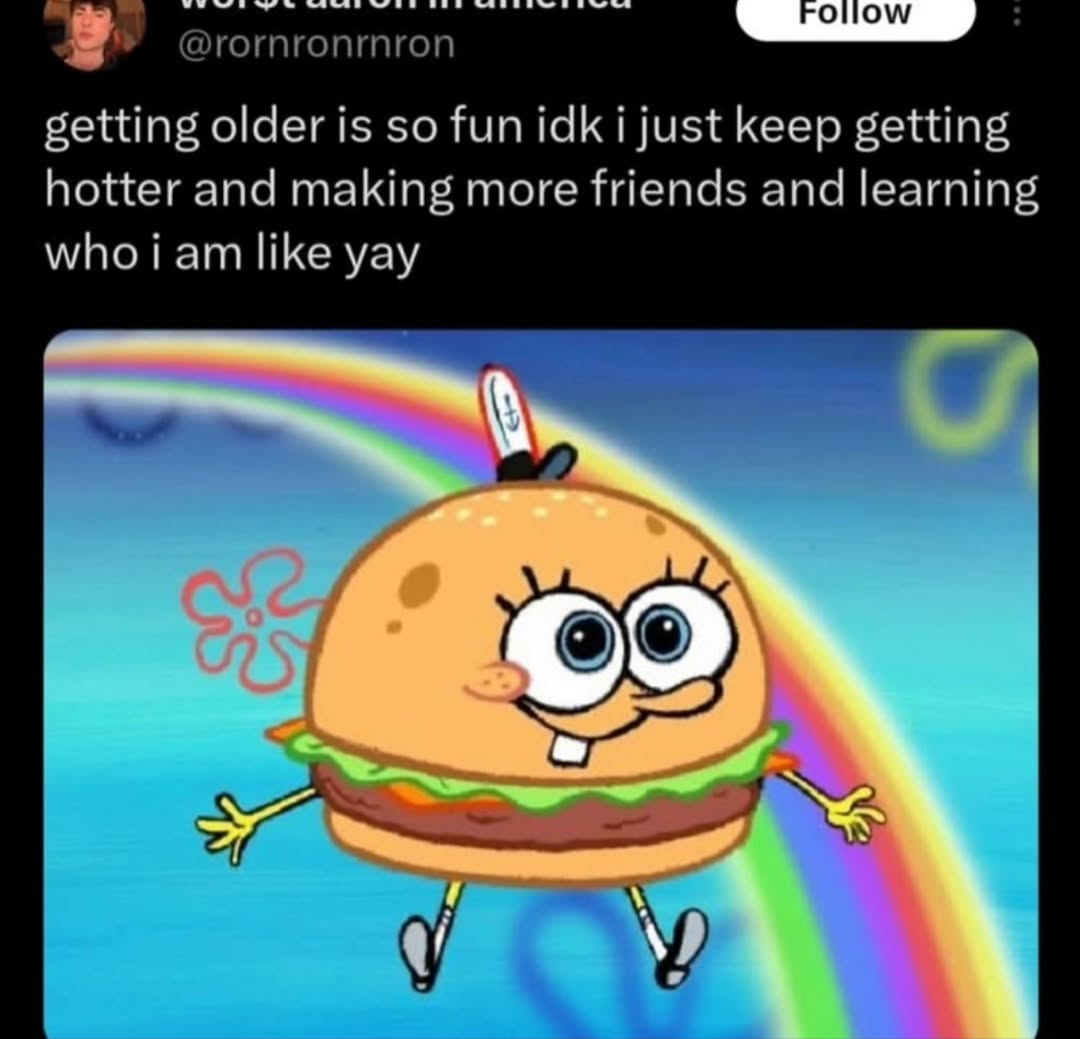 minus-squareNOPper@lemmy.dbzer0.comlinkfedilinkEnglisharrow-up1·3 hours agoYeah men I fucking loved my 20s. There’s a lot of variables here.