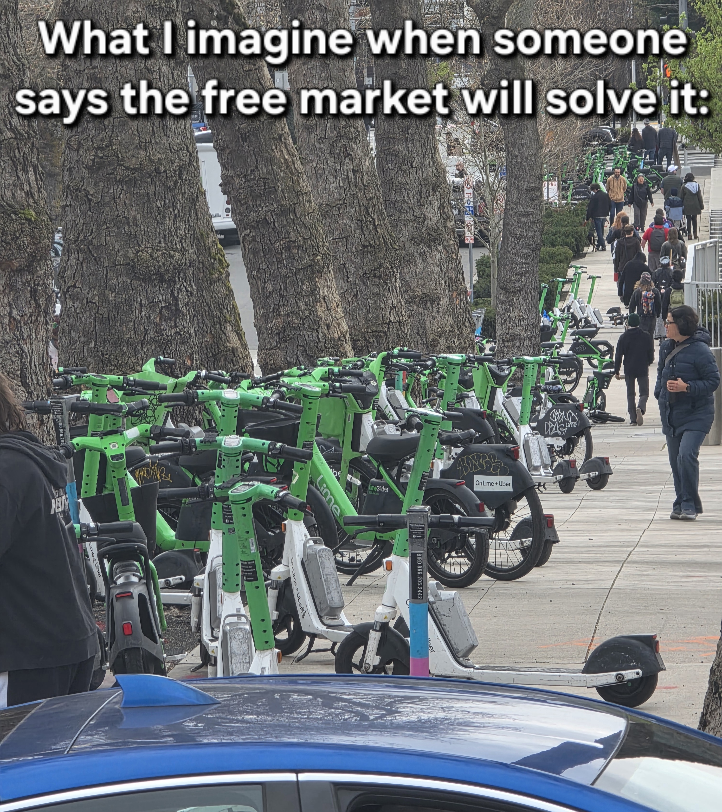minus-squarebalderdash@lemmy.ziplinkfedilinkarrow-up112arrow-down3·3 days agoFalse dichotomy. We can invest in public transit or even public bike/scooter rentals without allowing free reign for a private company to make profits. So we can all say “fuck cars” while simultaneously criticizing this e-waste as well.