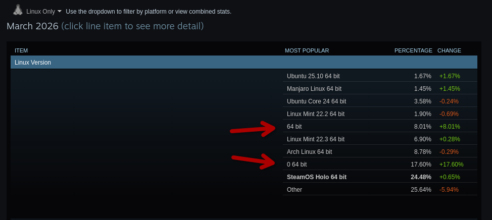 There are two new entries for most popular operating systems listed for Linux Only. This coinsides with the 5% breakthrough of total Steam population (finally). But I wonder if this is an error (or April Fool’s Day joke?). The two entries are just named 64 bit and 0 64 bit and its puzzling, as they have a huge percentage.
