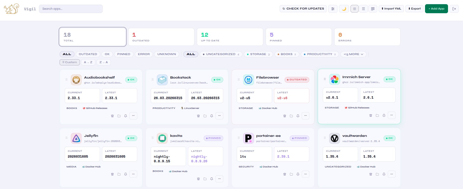 I’ve noticed that many people with home labs prefer to update their applications manually instead of relying on other apps that automate the process. Often, they have to check each one individually. That’s where Vigil comes in. The primary function of Vigil is to centralize the information and give users clear visibility of which applications are outdated, their current version, and the newer version available from several sources. This way, you can decide what and when to update.