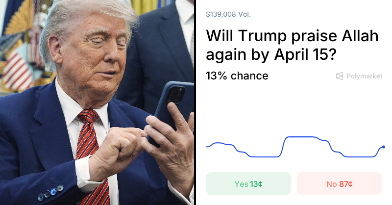 arrow-up1130arrow-down1external-linkPolymarket bet: Will Trump praise Allah again by April 15?polymarket.com8oow3291d@feddit.dk to Lemmy Shitpost@lemmy.world · 6 hours agomessage-square12fedilinkfile-text