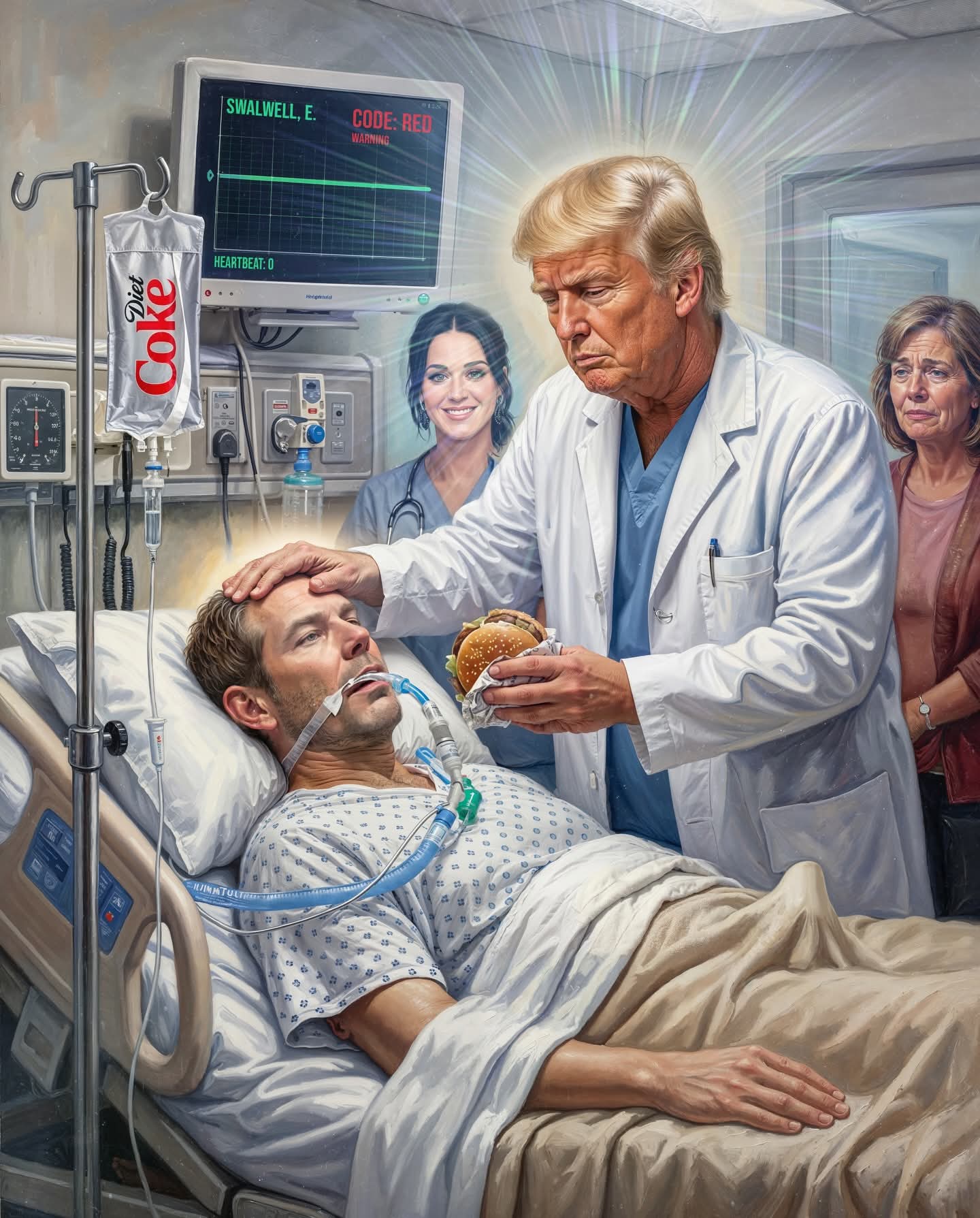 take this stupid image that people won’t stop sharing on the internet (which is EXACTLY what the prick wants) and make him look like a doctor, change iv to coke, shove a burger in his face