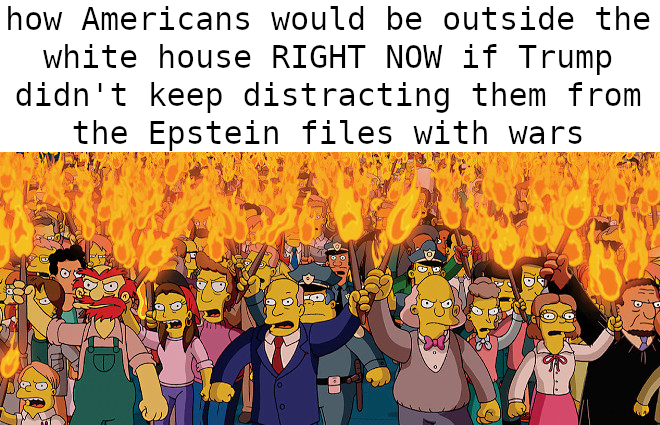 Sandouq_Dyatha@lemmy.ml to Memes@lemmy.mlEnglish · 2 days agoTrump better watch out, these Americans will make him pay the price any minute now!lemmy.mlimagemessage-square10fedilinkarrow-up1165arrow-down115