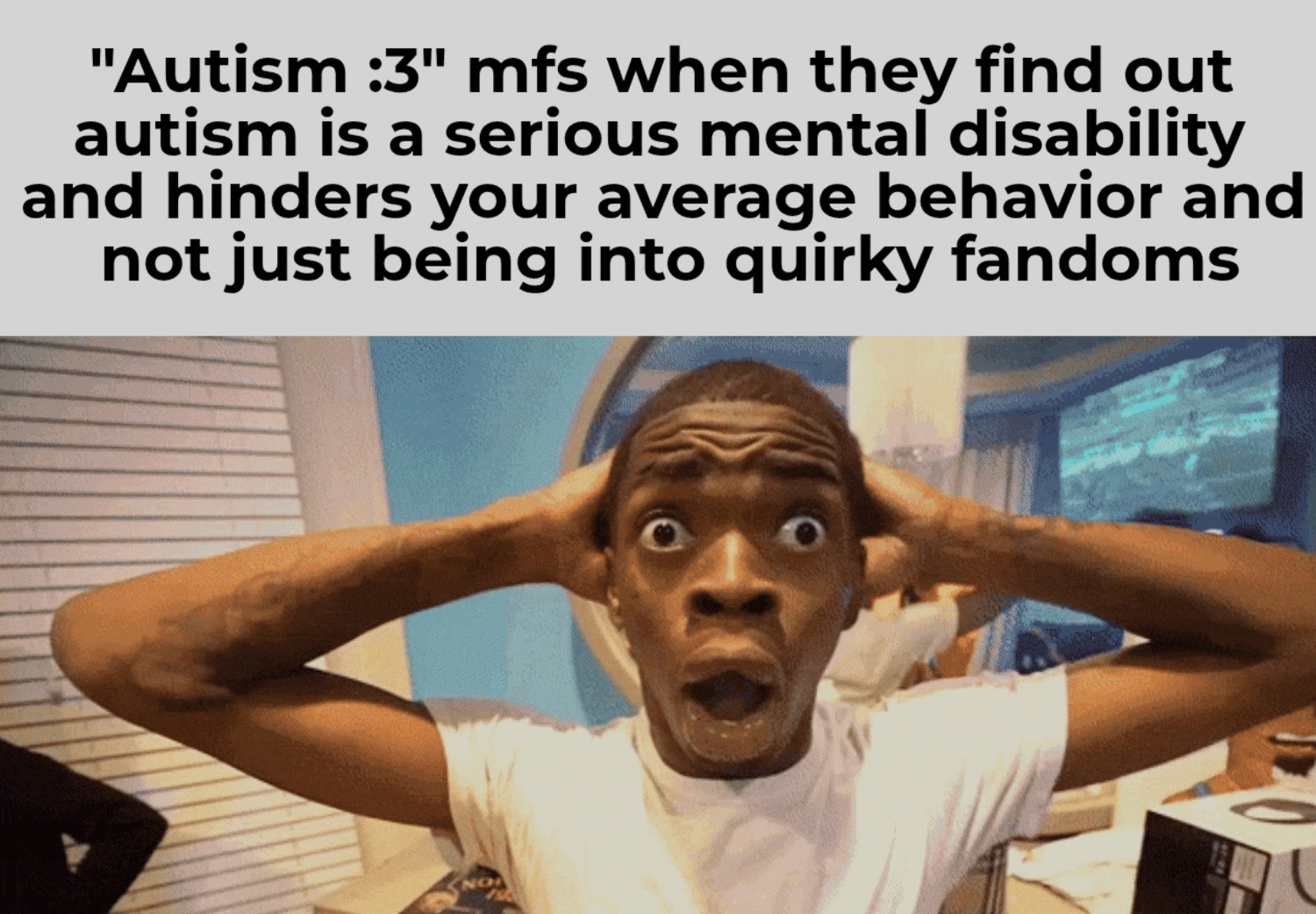 Hey let me have my jokes so I don’t freak out thinking about my serious social/spatial impairments and sensory oversensitivities. Or how the smallest break in my flow/routine throws off my whole week and I’m a dysregulated mess.