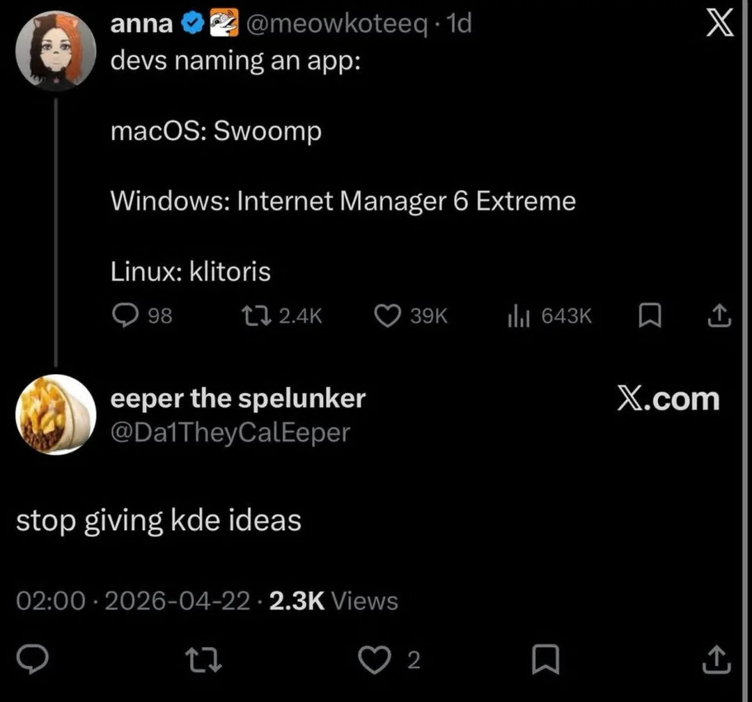 Horny teenage joke was just for surprise lolz I think, not a comment about KDE-involved names being horny (I think, every time I say something like this in any domain I end up learning about things I wish I hadn’t lol)