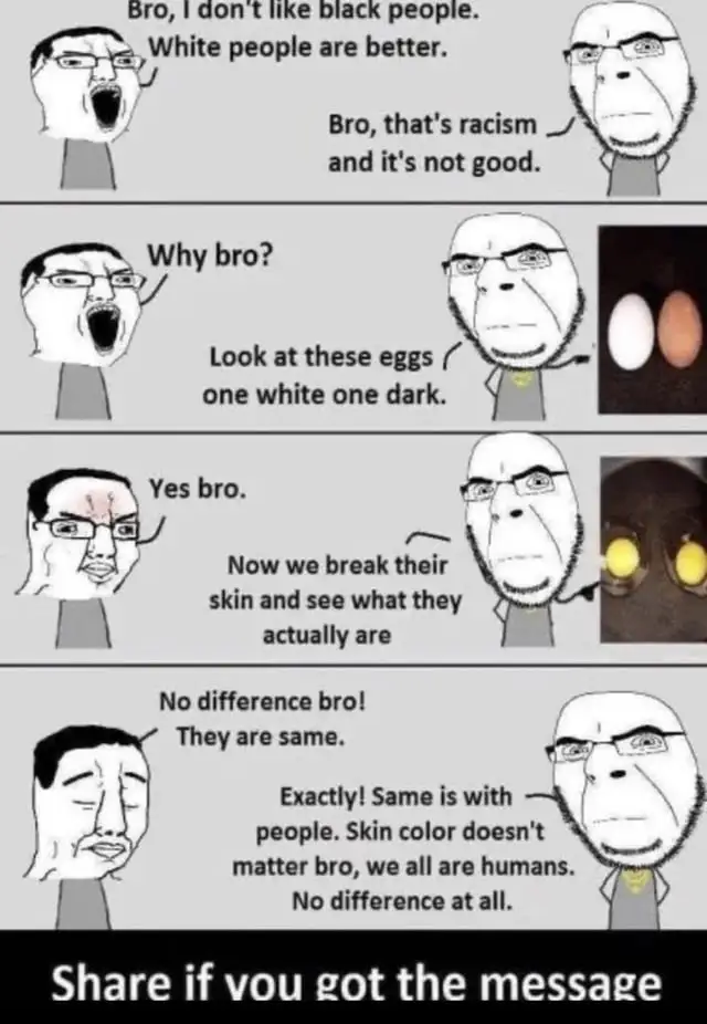 arrow-up1330arrow-down1imageEggs against racismfeddit.dkstenAanden@feddit.dk to Lemmy Shitpost@lemmy.worldEnglish · 18 hours agomessage-square78fedilinkfile-text