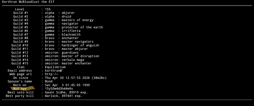 In regards to the screenshot “Mud age” is the same thing as /played or /age in MMOs. The amount of time spent logged in to the game.