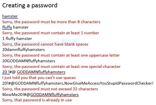 Sorry, you must have a special character. Oh... Not THAT special character, it has to be a special special character, that one isn't valid. Ah, no, that one's too long. It should be shorter. It needs to be between 11 and 11.5 characters.Half the time I now just enter random nonsense until it lets me create an account. Then, when I want to access a website/app again, I just ‘forget’ my password and reset it to some other random nonsense.