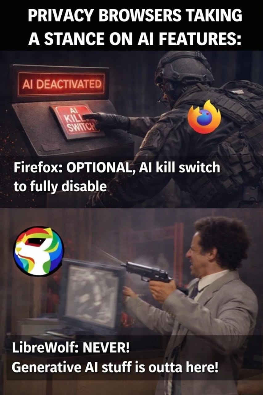 arrow-up156arrow-down1imageFirefox vs LibreWolf: Two Very Different Takes on AIlemmy.worldhellnuh@lemmy.world to memes@lemmy.world · 1 month agomessage-square12fedilink